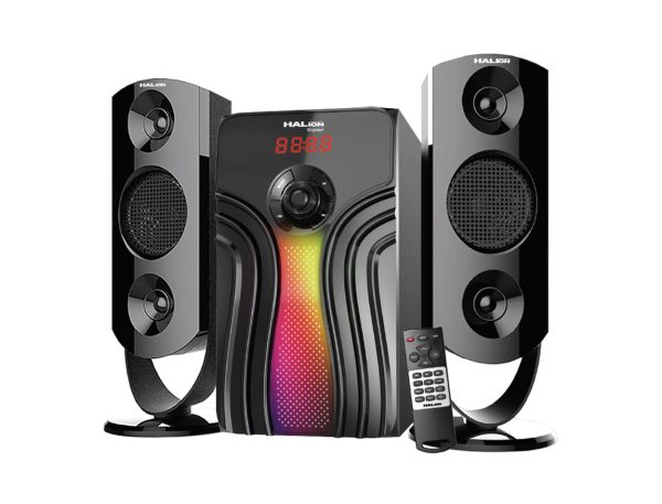 La reconocida marca Halion trae este moderno parlante 2.1 que cuenta con tecnología bluetooth para que puedas sincronizar tus dispositivos y mediante el parlante escoger tus canciones preferidas de tu playlist. Dispone de una potencia máxima de 120W.
